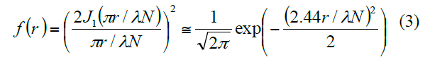 我們正在測量一個比距離 D 小的器件寬度。因此,這是一個亞衍射極限特征。這個系數來自于從點源發(fā)出的能量譜作為距離的函數。圖6中的艾里盤確定了能量譜在貝塞爾函數輪廓中為零的距離極限,這是以點源為中心的距離函數 [9]。這個能量輪廓在艾里盤內可以用高斯輪廓近似擬合,其系數為 2.44,這便于進一步的數學處理。從點源沿距離的能量譜可以描述為: