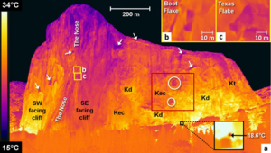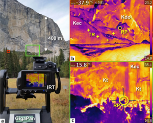 為了滿足這一需求,瑞士洛桑大學(xué)地球科學(xué)研究所通過(guò)將紅外熱成像技術(shù)與地面激光掃描技術(shù)結(jié)合起來(lái),遠(yuǎn)程檢測(cè)位于優(yōu)勝美地山谷(美國(guó)加利福尼亞州)的El Capitan的東南面完整的巖石橋。在1000米高的懸崖上進(jìn)行了四個(gè)小時(shí)的紅外熱監(jiān)測(cè),該溫度已在溫度下校準(zhǔn)并進(jìn)行了發(fā)射率效應(yīng)校正。在兩個(gè)定界的剝落薄片表面上出現(xiàn)的熱異?,F(xiàn)象解釋為巖石橋存在的跡象,得出了可能的巖石橋梁大小的估計(jì)值,然后將其用于評(píng)估兩個(gè)受監(jiān)控的剝離薄片的穩(wěn)定性條件。
